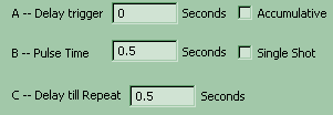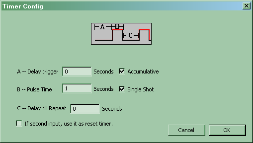 A : a vezérlő jel legalább ilyen hosszan kell, hogy stabilan magas értéken legyen, hogy az időzítő elinduljon. Ha az Accumulative ki van pipálva, akkor a Brain a futása ideje alatt „öszegyűjti” a vezérlőjel magas szintjének idejeit. Így csak az első impulzus kiadás előtt vár A ideig, mert a tár nem törlődik automatikusan.
