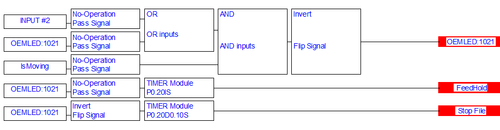 - Első lebeny: ha külső STOP aktív és a szánok mozognak, akkor bekapcsolja a markert. (OEMLED1021). Az öntartás a marker és a Stop jel logikai vagy kapcsolatával van megoldva. A marker a bekapcsolását követőn mindaddig aktív marad, amíg a bontó ág jele magas. A bontó ágat a szánok mozgását jelző IsMoving adja.