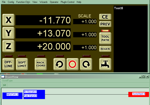A Mach3 rendelkezik egy kiegészítő funkcióval, amely lehetővé teszi bemenetek és kimenetek PLC szerű kezelését. Ez a Brain Editor, ami a 2007-es kiadása óta az 1-es verziószámot viseli. Ebből sejthető, hogy a fejlesztésével, hibajavításokkal azóta nem foglakoztak.