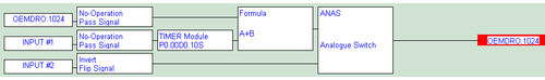 A léptető jelre kis késleltetéssel indul egy nagyon rövid időzítésű impulzus, ami a számláló aktuális értékével együtt egy képletbe (Formula) jut, ahol a két érték összeadása történik. A logikai érték itt számként van feldolgozva (0 vagy 1). (A kis késleltetés egy fizikai érintkező pergésmentesítését szolgálja.) A képlet számítási eredménye egy analóg kapcsolón keresztül íródik a számlálóba. (A számlálót első használat előtt alaphelyzetbe kell állítani!)