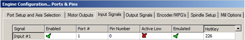 Az emulálás feltétele, hogy az adott bemenet engedélyezzük, adjunk meg egy létező Port számot! A Pin-t 0 (nulla) értékre érdemes beállítani, így egy valódi bemeneti érték nem zavarhat bele a dologba. Meg kell adni még egy billentyűt vagy kombinációt, amivel a jelet aktiváljuk! Itt javasolnám a magyar billentyűzet ékezetes gombjait. A Mach3 fejlesztői sok billentyűzet-kombinációt már előre meghatároztak, de ezekkel nem „számoltak”.